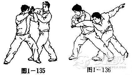 【用法】翻打跌系贴身反跌技法.如上势我坠压敌肘,敌如化解还击,我可就势采制敌腕,将其向我本右侧牵拉,同时以左小臂滚压敌肘关节,使其跌仆(图1-135,136).