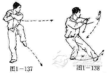 (2)上动不停,左脚向右前方落步,脚尖内扣,右腿屈膝成右屈膝丁字步;同时左掌随落脚之势向左前方伸出。目视左前方(图1-138),