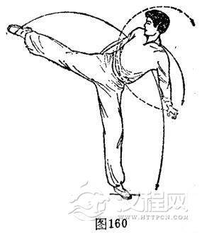 重心左移,体向左侧倾。左脚左内碾地60度成直腿踏实。右脚随左内碾地由右下方离地脚背绷直,向右后上方顺时针划弧后摆腿。与此同时,双手由体两侧顺时针划弧摆杯,右手位于右后方,左手位于左侧下。体成左独立右后摆腿势,目视右脚。(图160)