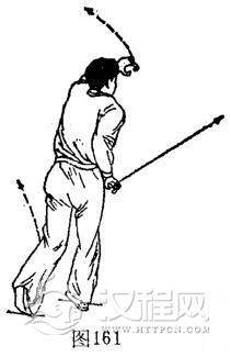 ①摆腿盖压杯:重心在左,体下蹲。左脚左内碾地约180度成屈膝后跟抬起,前掌着地。右脚由右侧上方随左内碾地向上、向后、向左侧后下方顺时针划弧后摆腿着地,位于转体后的右下方,.屈膝踏实。与此同时,双手由体左右两侧随后摆腿顺时针划弧盖压杯,右手压杯于胯外侧屈肘,左手盖杯位于面门前上方。体成屈膝左盖右压杯势,目视右侧前方。(图161)
