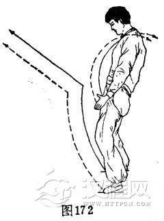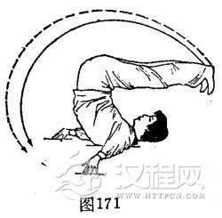 ②摔背倒踢腿:体由空中蹬腿势下落着地,摔背。双手随体下落由体两侧向下划弧撑地。与此同时,双脚由体下方向上、向回、过体上方向下顺时针划弧倒踢腿。体成仰身摔背倒踢腿势,目视面门上方。(图171)
