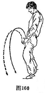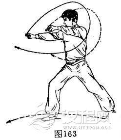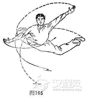 ③抡臂旋子:上动不停,重心在右,体腾空。双手由体右侧逆时针划弧抡臂(右手抡臂约720度低于肩,左手抡臂约390度高于肩)。双脚随抡臂左转360度离地旋摆腿(右腿旋摆腿约180度,左腿旋摆腿约90度)。体成腾空旋势,目视面门前下方。(图165)