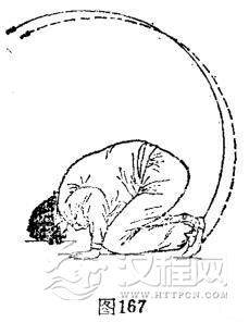 ①屈膝前俯头顶地:重心在体正中,体下蹲。双手由体两侧外向上、向前下方逆时针划弧撑地。与此同时,体前俯头顶着地。休成屈膝前俯顶头撑地势,目视地面。(图167)