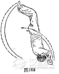 ②头手翻:头顶地,体倒立。双手撑地推体,双脚由后下方离地向体后上方逆时针划弧摆腿,微屈膝。体成顶头撑地摆腿势,目视面门前方。(图168)