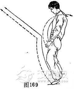 ③摆腿站立:下动不停,双脚由体上方继续向后下方逆时针划弧摆腿着地,体随摆腿着地成站立,双腿微屈膝,后跟抬起,前掌着地。与此同时,双手用力推地向上、向回、向体两侧划弧摆掌。体成两腿开立势,目视体前下方。(图169)。