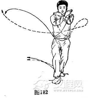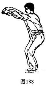 ①并步穿掌:重心左移,体屈膝并步。右脚由右前下方离地向回、经左脚内侧向右侧后方撤一步屈膝踏实。左脚在右脚踏实后向右脚内侧并一步屈膝踏实。与此同时,双手由体胸前向下、经两腰侧向两侧外、向右侧前上方划弧穿掌,高于肩。体成并步穿掌势,目视两手正中。(图183)