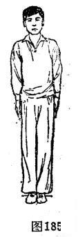 上步并步立正势 重心有移,体并步立正。左脚向左前方上一步直腿踏实。右脚在左脚踏实后向左脚内侧方并一步直腿踏实。与此同时,双手自然下垂于两胯外侧。体成并步立正势,目视正前方。(图185)