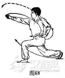 重心左移,体左转。双脚前掌左外碾地135度成左屈膝踏实,右脚后跟抬起,前掌着地成半跪步。与此同时,右手随体左转由右侧前上方向下、过体档前向左上方顺时针划弧云杯敬酒,位于转体后的右前方,与肩同高。体成右半跪步右云杯敬酒势,目视右手。(图68)