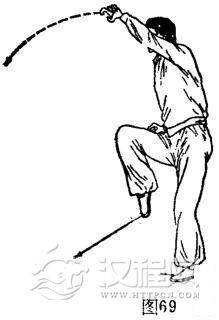 ①右提膝摆盖杯:重心在左,休上升。左脚左外碾地30度成直腿踏实。右脚随左外碾地由右后下方提膝,脚背绷直。与此同时,右手由右前方向上、向休左胸前转向下、经腹前向右顺时针划弧摆按杯。左手由左腰侧向左侧后、向上、转向前逆时针划弧摆杯,高于头。体成左独立右按左盖杯势,目视左手。(图69 )