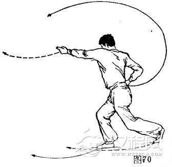 ②右醉浪步盖杯。上动不停,重心在左,体下蹲。左脚左内碾地15度成屈膝,后跟抬起,前掌着地。右脚随内碾地向左脚前方浪沧醉落一步(踩踏,攻其敌方下部),脚尖内扣,屈膝踏实。与此同时,左手由左前上方向前、向下、向划弧盖杯,与肩同高。体成右醉步左盖杯势,目视左手。(图70 )