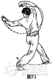 ③左浪右叉斟酒势:上动不停,上下同动,重心在右,体成叉步。右脚右外碾地30度,左脚随右外碾地由左后上方向右脚前浪沧醉进一步(脚外侧踩踏,攻其敌方下部).脚尖外撇,屈膝踏实。右脚在左脚踏实后即刻向左脚后方外侧浪沧醉叉一步(脚内侧踩踏),后跟抬起,前掌着地。与此同时,左手由左前方向前划弧摆杯,高于有。右手随右叉步由右腰侧变八字指向右侧后、向上、过头顶向下逆时针划弧摆指斟酒,微屈肘。体成叉步斟酒势,目视左手。(图71)