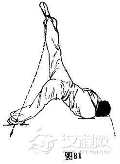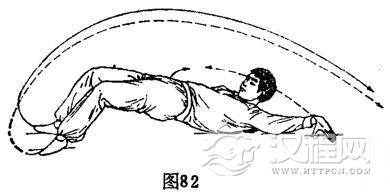 ①打腿仰身:重心在右,体仰身。右脚右内碾地90度成屈膝,全脚着地,体左转90度成仰身,挺胸挺腹,背部着地,含领勾头。左脚随体左转由左侧上方向下、向右脚内侧顺时针划弧打腿,全脚着地,屈膝。与此同时,左手由右胸前离地向上、向左侧下方顺时针划弧摆臂,着地。体成仰身挺胸挺腹势,目视两脚正中下方。(图82)