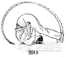 ③鲤鱼打挺:上动不停,上下同动,体站立。双脚由头后向上、向体后下侧逆时针划弧打腿。与此同时.双手用力推大腿。体随打腿、推腿即离地站立。两手立于体两胯外侧。体成两腿开立势,目视体下方。(图84)