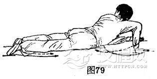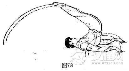 体仰躺。左手由体左侧向下划弧着地位于左胯外侧。右手由体右侧离地向右胯外划弧着地。与此同时,双脚由体下方向上、向回、向头后上方逆时针划弧倒点腿。体成仰身倒点腿势,目视双脚正中。(图78)