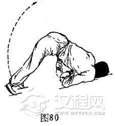 ①点腿俯地:体俯身。双脚由头后上方继续向头后下方划弧倒点腿着地,体成俯地势。与此同时,双手由体后两侧下离地向上、向回、向下逆时针划弧翻掌,左手直臂着地,右手屈肘着地。体成俯地势,目视左侧下方。(图79)