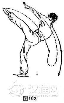 ①右独立摆掌:重心右移,体后仰。右脚踏实。左脚由左下侧离地,脚背绷直向前上方顺时针划弧摆腿,高于腰。与此同时,左手由右腋下向左侧前方逆时针划弧摆掌,略高于肩。右手由右前方向左逆时针划弧摆掌。体成右独立摆腿摆掌势,目视左前方。(图103)