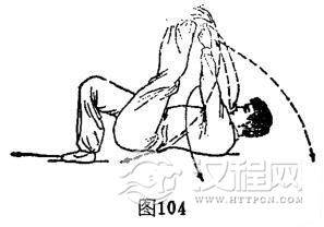 ②右单跌左脚斟酒:上动不停,重心在右,体下跌。左脚由左前方向上、向回、向下顺时针划弧勾踢腿斟酒。与此同时,右手由左胸前向右侧外下方顺时针划弧摆掌,着地撑休。左手由左前方向左侧外下方、转向前上方顺时针划弧摆掌,变端杯手接酒,位于左脚背下端。.体成仰身斟酒势,目视左手。(图104)