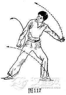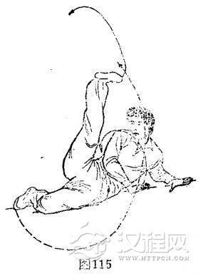 ①翻身右旋摆腿:体右后翻转90度成左侧卧势。左脚随体右后转由左下侧离地逆时针划弧摆收腿,屈膝贴地。右脚随体右后转由右下方离地向前、后回、向上逆时针划弧约360度旋摆腿。与此同时,双手随体右转由体前离地向左侧外逆针时划弧摆掌,着地撑体。体成左侧卧旋摆腿势,目视右前方。(图115)