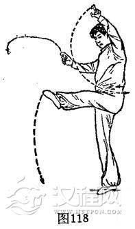 ②左浪合摆杯:上动不停,重心右移,体上升。右脚右外碾地15度成直腿踏实。左脚随右外碾地由左下方离地,脚背绷直向上、向右腿前逆时针划弧浪合腿,与腰同高。与此同时,双手由体左右两侧逆时针划弧摆杯,左高右低,微屈肘。体成右独立合腿摆杯势,目视左脚。(图118)