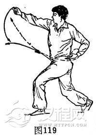 ⑧左醉步摆压杯:上动不停,重心在右,体下蹲。右脚右外碾地45度成屈膝,后跟抬起,前掌着地。左脚随右外碾地由右腿前向右脚前划弧浪沧醉落一步(脚内侧踩踏,攻其敌方中下部)屈膝踏实。与此同时,左手由体左侧上方向右前方、经右腹前向左侧逆时针划弧压杯。右手由右前向前上方、向回逆时针划弧摆杯,略高于肩。体成左屈膝右摆杯势,目视右手。(图119)