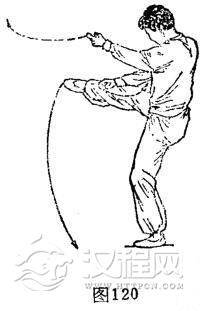 要点:提气、收腹、拧腰、收右胯,旋摆腿快速有力。