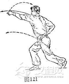 ⑨右醉步左摆杯:上动不停,重心在左,体下蹲。左脚左外报地30度成后跟抬起,前掌着地,屈膝。右脚随左外碾地由右前方向左脚前浪沧醉落一步(脚内侧踩踏,攻其敌方中下部),屈膝踏实。与此同时,右手由右前方向回、向右腰侧划弧收杯。左手由左前方向前、向右顺时针划弧摆杯,略高于肩。体成右屈膝左摆杯势,目视左手。(图121)