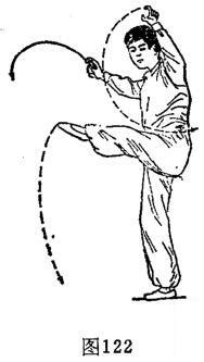⑥左浪合摆杯:上动不停,重心在右,体上升。右脚右外碾地15度成直腿踏实。左脚随右外碾地由左后下方离地,脚背绷直向前上方逆时针划弧浪合腿,与腰同高。与此同时,右手由右腰侧向右侧外、向前上方逆时针划弧摆杯,高于肩。左手由左前方向头顶右侧方顺时针划弧摆杯,高于头。体成右独立左浪合腿摆杯势、目视体左侧。(图122)