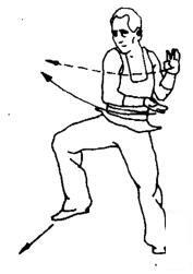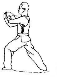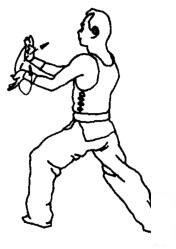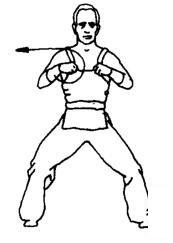 上动不停,两掌变拳,两肘同时向外顶撞,力达肘尖。