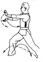 左掌收至右胸前,同时右掌臂边外旋边屈肘顺时针绕行,经左小骨前向左上方穿出,与左臂成交叉。