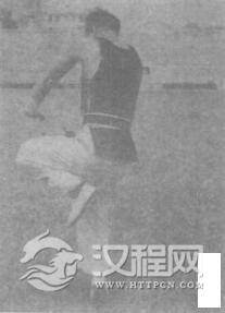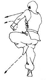 右脚提起,紧接左脚蹬地跃起腾空。身体向右转90度,同时蝶掌经下向右后弧形摆动。