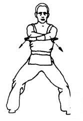 左脚向后退一步身体左转面向南成马步。同时两掌臂内旋经上向里弧形绕行成左臂在外的交叉。