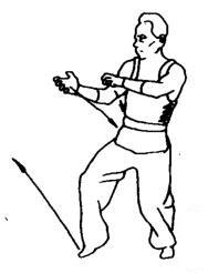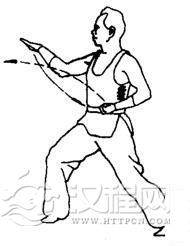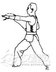 上动不停,左拳变掌向前直插。随之右掌收回腰间。