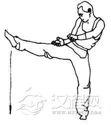 上动不停,两爪屈肘稍向左下拖抖。同时右脚向前上方弹踢,力达脚尖。眼看右脚。
