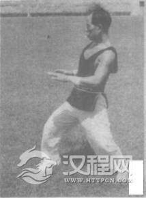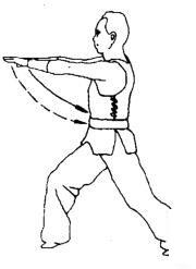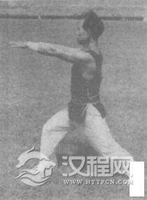 上动不停,身体左转90度成马步,同时蝶掌向前推出。眼看蝶掌。