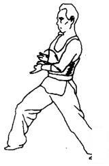 上动不停,身体右转成马步,同时蝶掌向前推出。眼看蝶掌。