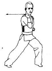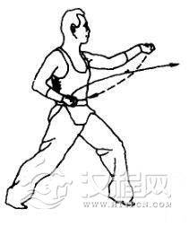2.上动不停,身体右后转成右弓步。同时右拳向前伸出,高与肩平。