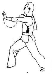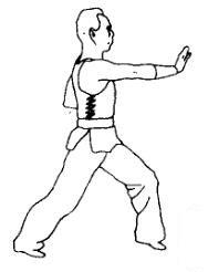 3.上动不停,左拳变掌(也可不变)向前击出成立掌,右奉随之屈肘收回腰间。