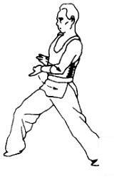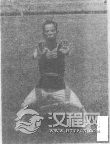 2.上动不停,身体左转成马步,同时蝶掌向前推出,眼看蝶掌。
