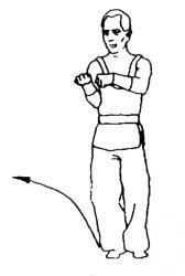 上动不停,右臂内旋逆时针绕行半周置于右肩前。与此同时,左拳臂外旋逆时针绕行半周置于右拳下方。