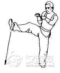 两拳不动,右腿屈膝上提。随即以脚背为力点向右前上方弹踢出去。眼看右脚尖。
