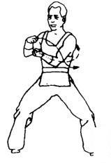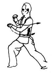 步型不变,左拳臂内旋,再外旋逆时针绕行里于胸前。同时右拳屈肘经右上向左弧形运行里于左举上方。