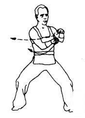 身体徐徐右转成右弓步。随转体,左拳臂以挠骨侧为力点经右前臂向前徐徐用力推送。右拳经左肘下收回腰间。同时发出“唔一”的鼻音。