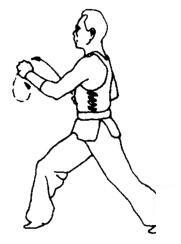 右拳经后下方向前上方成弧形抄起,停于右肩前约20厘米处。左拳随之屈肘向右收至右腕内侧。眼看右拳。