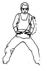 步型不变,上体向左拧转,同时两掌屈肘向左上方挑格,置于左肩处。眼看两掌。