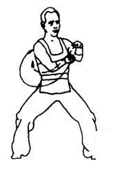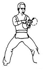 步型不变,右拳臂外旋经下顺时针在体前绕行里于脚前。同时左拳屈肘,经左上向右绕行置于右拳上方。