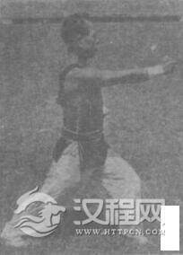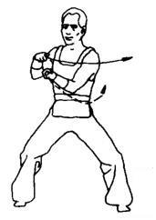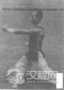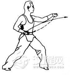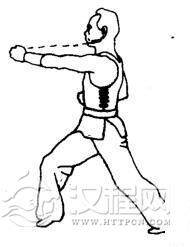 上动不停,右拳向前直冲,左拳随之收回腰间。同时发出“啊—”的声音。眼看右拳。
