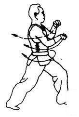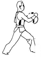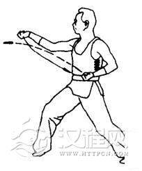 身体徐徐向左转成左弓步。随转体,右拳臂以挠骨侧为力点经左小臂向前徐徐推送。同时,左拳经右肘下收回腰间。随之发出“唔—”的鼻音。