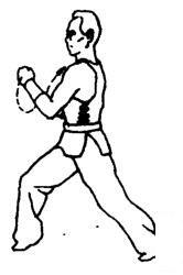 上动不停,身体左转成左弓步,同时左拳向前伸送。