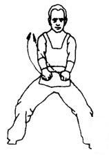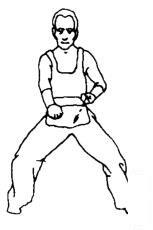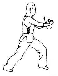 上动不停,身体左转成左弓步。同时两拳经上向前挂击,拳与肩同高同宽。