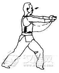 上动不停,左肘下沉,左掌经左向下划弧至左腰间。